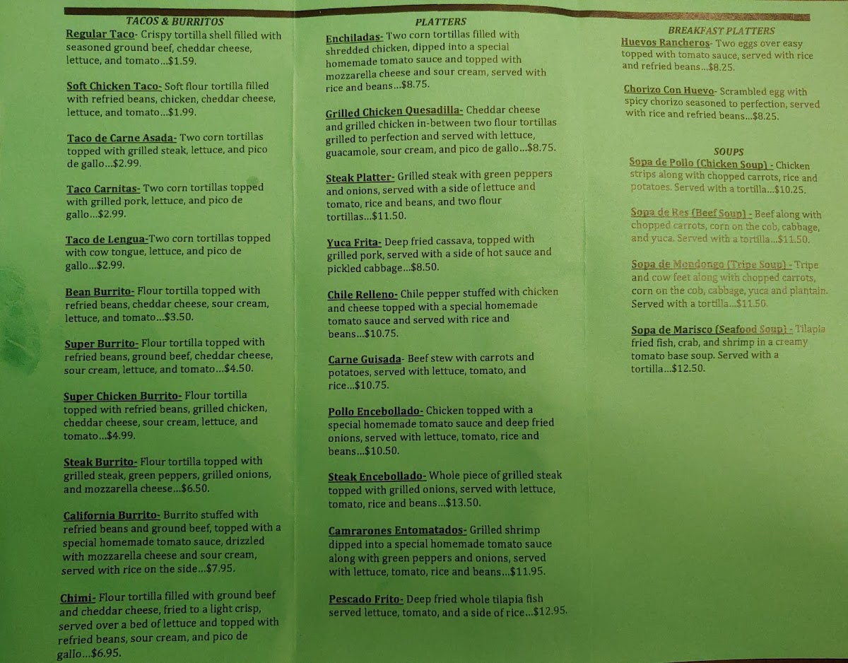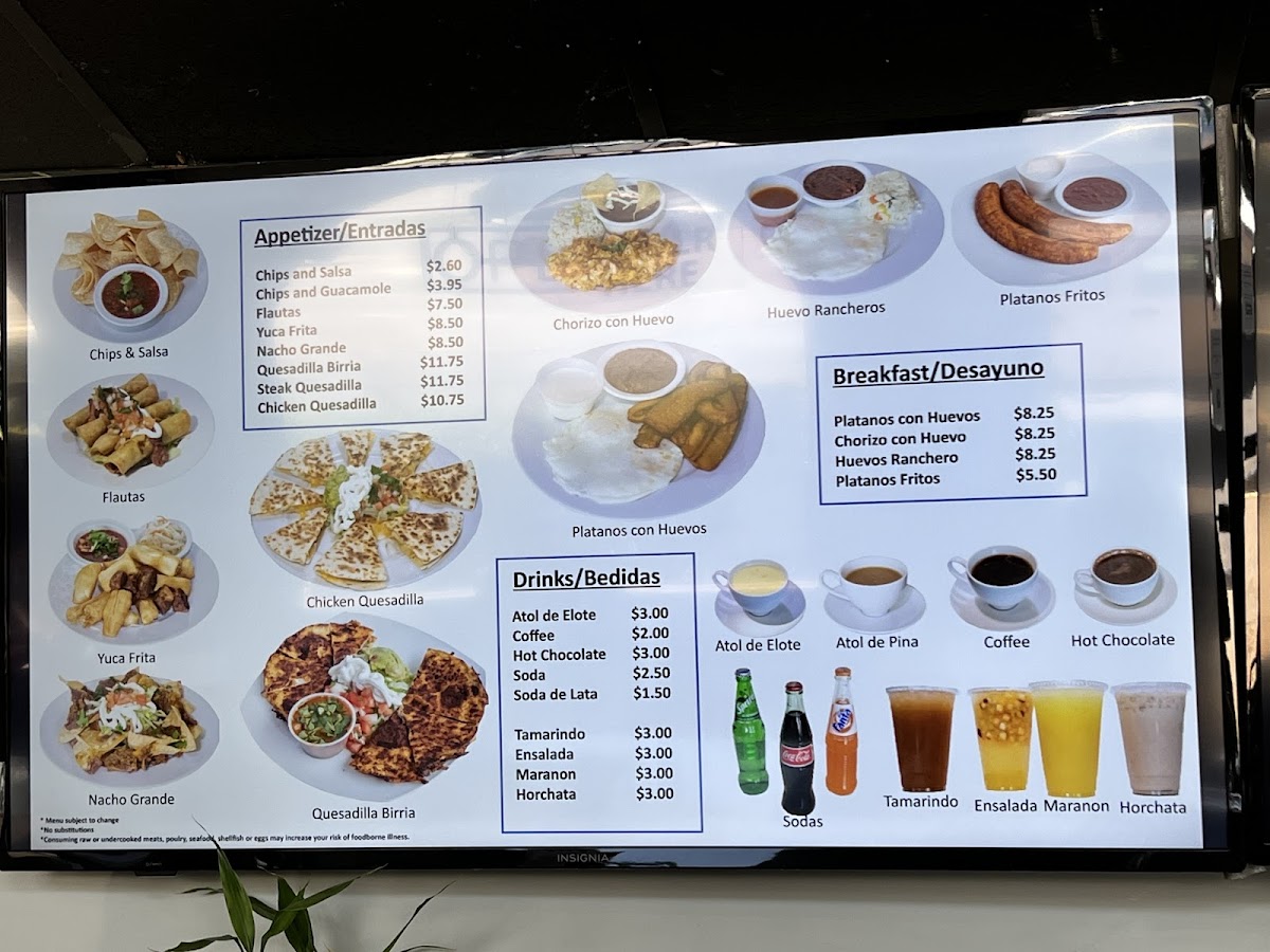 Light appetizers like chips with salsa or guacamole create a welcoming start, while traditional breakfast items, including huevos rancheros and platanos con huevos, offer a warm and familiar way to begin the day. The drink choices, from classic horchata to hot chocolate and fresh juices, complement the meals with comforting, authentic flavors that enhance the overall dining atmosphere.